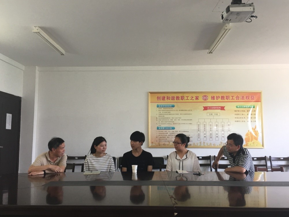 我校驻农村工作队队长叶俊同志及队员王志同志带领该同学领略校园风光,感受校园氛围,接下来到公共课部开展结对帮扶教师见面会。座谈会由公共课部主任王贵槐同志主持。结对帮扶教师数学教师郭芸和英语教师柯欢欢热情询问了张子豪同学的思想、学习、生活情况,激励他以乐观的心态面对困难,以饱满的热情继续学习,表示乐意随时提供指导帮助。
